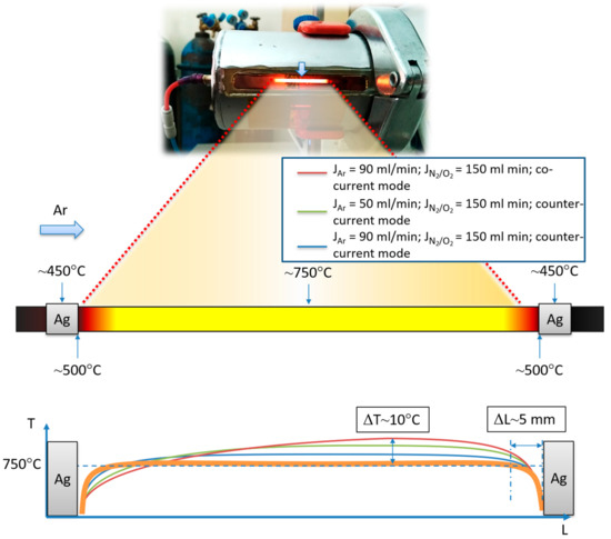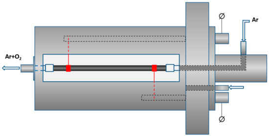 Oxygen and nitrogen were supplied in various proportions inside the reactor, and argon was supplied into the membrane. The flow rate of the sweep gas (90 ml/min) and the flow rate of feed gas (150 ml/min) were constant throughout the experiment. These values and counter-current flow mode were selected earlier and determined as necessary and sufficient for the experiment, in particular for the uniform distribution of heat along the membrane. The controlled heating of the membrane was carried out by the current regulator, which ensured the necessary temperature regime during the experiment: Vheat = 350 °C/h.