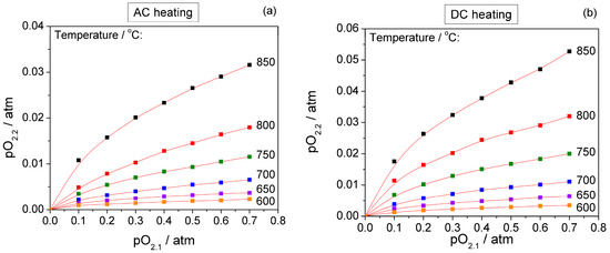 Dependence of oxygen partial pressure on the permeate side (pO2.2) of (a) AC- and (b) DC-heated HFMs on the temperature and oxygen partial pressure on the feed side (pO2.1).