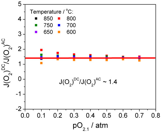 From the obtained data (Figure 6), the linearization of the measured oxygen fluxes was performed in the pO2.10.5–pO2.20.5 coordinates (Figure 7a,b) according to [15]. The values of γ were obtained from the slope of the dependencies, and the activation energies (89 ± 4 and 94 ± 2 kJ/mol for the AC- and DC-heated HFMs, respectively) of the oxygen fluxes in the AC/DC-heated HFMs were determined from an Arrhenius plot (Figure 8a,b). The obtained values are close to literature data for Ba0.5Sr0.5Co0.75Fe0.2Mo0.05O3-δ samples [16].