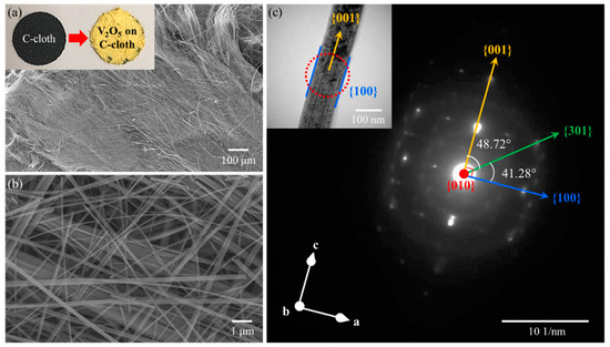 In the presence of hydrogen peroxide (H2O2), the morphology of vanadium oxide was transformed from powder to fibrous morphology via a simple one-step hydrothermal process. Incorporating carbon cloth during the hydrothermal process allows for the growth of vanadium oxide on carbon cloth in the absence of a binder, as indicated at the inset of Figure 1a. After the hydrothermal process, it can be seen that the yellowish vanadium oxide completely covered the surface of the carbon cloth with average mass loading of 3.19 ± 0.609 g cm−2. As illustrated in SEM images (Figure 1a,b), the produced vanadium oxide had a nanofiber morphology with diameters of (~100–200) nm. In addition, as shown in Figure S1, the length of the produced vanadium oxide is centimeter-long. In Figure S2, energy dispersive spectroscopy (EDS) analysis of the centimeter-long nanofibers is shown. Based on the EDS results, these nanofibers have an average atomic percentage of 28.98% V and 71.02% O which corresponds to V2O5, with a theoretical atomic percentage of 28.57% V and 71.43% O. These centimeter-long nanofibers were analyzed under TEM and selected area electron diffraction (SAED) (Figure 1c). As highlighted by the discrete spots, it can be observed that the fibers are single crystal. Due to its yellowish color (V5+), EDS analysis, and the diffracted pattern, it can be deduced that the formed nanofibers are vanadium pentoxide (V2O5). SAED results show that the V2O5 nanofibers grow along the <001> with {100} and {010} facets. These agree well with the Wulff constructed equilibrium shape of V2O5, as seen in Figure S3 where V2O5 has a belt-like morphology. The large surface corresponds to the lowest surface energy plane {010}, while both {100} and {001} with surface energies greater than {010} by an order of magnitude, were observed at the tip and sides of the particles, respectively [35].