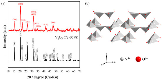 (a) XRD spectrum of the produced nanofibers and the corresponding XRD pattern of V2O5 with ICDD 72-0598 (b) Schematic diagram of V2O5 structure.