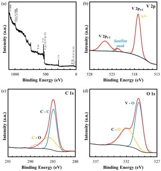 In Figure 3, the purity of the produced BCS-VONF was confirmed by XPS analysis. The wide scan spectrum, as in Figure 3a, demonstrates the presence of V, O, and C in the sample. The narrow scan spectrum of V 2p (Figure 3b) matches well with V5+, as indicated by the 2p3/2 and 2p1/2 at 517.2 eV and 524.61 eV, respectively, in the absence of other oxidation states of V [27,28]. The spin-orbit splitting between the measured 2p3/2 and 2p1/2 is 7.41 eV. This is in good agreement with the standard value of 7.4 eV for V2O5. It can also be noted that a satellite peak can be observed at 521.74 eV of the V 2p core spectra of pure V2O5 which can be attributed to the strong hybridization between V 3d and O 2p levels [37,38]. The deconvoluted peaks of O 1s (Figure 3c) at 529.96 eV and 531.91 eV correspond to V–O and C–O, respectively [27,28]. On the other hand, the deconvoluted peaks of C 1s (Figure 3d) at 284.86 eV and 285.86 eV can be attributed to C–C and C–O, respectively. The presence of C–O peaks is due to the surface oxidation of carbon cloth during the hydrothermal process in the presence of H2O2.