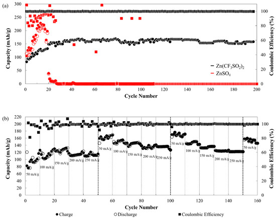 (a) Gravimetric charge–discharge test of BCS-VONF at 100 mA g−1 current density using 3.0 M Zn(OTf)2 (black) and 3.0 M ZnSO4 (red). The black and red square markers refer to the coulombic efficiencies using 3.0 M Zn(OTf)2 and 3.0 M ZnSO4, respectively. The hollow and filled circles correspond to charge and discharge capacities, respectively. (b) Rate capability of BCS-VONF with voltage window of 0.4–1.8 V.