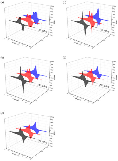dQ/dV vs. V plots of BCS-VONF at different applied current densities: (a) 50 mA g−1, (b) 100 mA g−1, (c) 150 mA g−1, (d) 200 mA g−1, and (e) 250 mA g−1. The first (black), second (red), and third (blue) correspond to the repetition of the applied current density on the rate capability test, as in Figure 4.