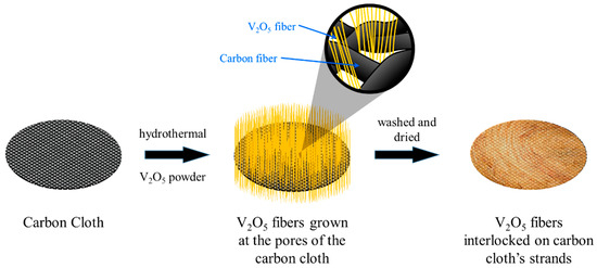 In a typical procedure, 0.36 g of vanadium (V) oxide (V2O5, Sigma-Aldrich, St. Louis, Missouri, USA), was added to 60 mL DI water. The solution was rapidly stirred for 5 min. Then, 5 mL hydrogen peroxide (H2O2, 30 w/w%, Merck KGaA, Germany) was added to the above solution and rapidly stirred for 1 h. Consequently, a noticeable change in color from orange to reddish orange took place, and a transparent orange was duly observed. Thereafter, the solution was transferred to a 100 mL Teflon-lined autoclave containing carbon cloth which was subsequently placed on a pre-heated oil bath at 180 °C and kept heated for 120 h. The solution was then allowed to cool at room temperature, i.e., 30 °C. The carbon cloth containing the golden yellow fibers was washed several times with DI water and isopropanol (QRëC, New Zealand). Finally, the sample was dried overnight at 70 °C under vacuum.