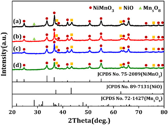 X-ray diffraction studies revealed the crystal phase and structural properties of the prepared NiMnO3. The XRD pattern of NiMnO3 showed diffraction peaks similar to the perovskite oxide phase, which exhibited structural stability and conductivity, as shown in Figure 2. Additionally, all samples exhibited the NiMnO3 phase (JCPDS No. 75-2089) and small impurity peaks, such as Mn5O8 (JCPDS No. 72-1427) and NiO (JCPDS No.89-7131), along with diffraction peaks of NiMnO3. Diffraction peaks of impurity appeared due to a less-formed solid phase as the reaction time decreased. As can be seen in Figure 2a,b, the diffraction peak of Mn5O8 disappeared when the hydrothermal synthesis reaction time was longer than 6 h. Transition metal oxides should have low impurity that induces low charge mobility and electroconductivity [41]. The other diffraction peaks of impurity diminished as the reaction time increased over 6 h. Compared with other samples, NMO-8 exhibited a lower peak intensity, as shown in Figure 2d, which may be attributed to the low level of crystallization related to redeposition onto larger crystals [41].