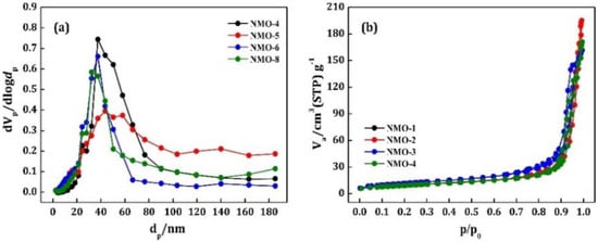 Figure 3 shows the specific surface area, pore volume, and size distribution of NiMnO3 via one-step hydrothermal synthesis with different synthesis times. The supercapacitor electrode materials require a high specific surface area, which is related to the large active surface area and electrochemical double layer. The duration of synthesis affected the crystal morphology as well as the specific surface area. The specific surface area of NMO-6 was 40.821 m2·g−1 and was higher than the other samples (Table 1 and Figure 3b). The large surface area of NMO-6 associated with particle size or morphology was controlled by hydrothermal synthesis at low temperatures. The specific surface area of the NMO-8 sample decreased due to the agglomeration of nanocube morphology, as shown in Figure 1d,h. The dense nanocubes in the three-dimensional hierarchical structure reduced the pore diameter and increased the surface area (Table 1). A high specific surface reduced the overpotential of ORR via the accelerated mass transfer of reactants and reaction products [42], increasing the stability of the material for efficient charge transport and enhanced ORR electrochemical catalytic activity.