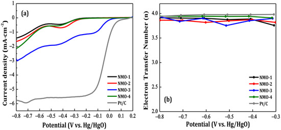 RRDE experiments were conducted to identify the performance of the perovskite oxide as ORR electrochemical catalytic material. Because the commercial ORR catalyst, Pt/C, is expensive, cost-effective perovskite oxide was considered as an ORR electrochemical catalyst in this study. Perovskite oxide is a good electrochemical catalyst for energy conversion and storage devices as it enhances the movement of oxygen ions through the oxygen vacancies [45]. The electrochemical catalytic activity is determined by the B-site transition metal in the perovskite structure [46]. The diffusion of oxygen vacancy or cation in the transition metal oxide affects ORR catalytic activity due to changes in the lattice and electronic structures. The high specific surface area and oxygen vacancy improve the conductivity and ORR catalytic activity due to multiple catalytic active sites on the surface. Despite the difference in onset potential compared with commercial catalysts such as Pt/C, NMO-6 exhibited higher electrocatalytic activity compared with other samples due to high specific surface area and oxygen vacancy (Figure 5a). The transition state of the Mn in the B-site of NiMnO3 from Mn4+ to Mn3+ increased the active site on the surface, conductivity, and the catalytic activity of the electrode material due to the oxygen vacancies generated. NMO-6 samples with a high ratio of Mn3+ in the B-site had high ORR catalytic activity compared to other samples because the higher Mn3+ caused many oxygen vacancies to satisfy the electrical neutrality. Oxygen vacancies can provide multiple catalytic active sites. Therefore, NMO-6 exhibited higher catalytic activity than other samples. The ORR catalyst also exhibited high current density at the same potential state. To confirm this finding, the potential of each sample was compared at a constant current. As a result, NMO-6 displayed higher potential state than the other prepared samples. ORR can proceed by a two-electron pathway or a four-electron pathway [47]. The two-electron reaction is associated with a low conversion efficiency due to hydrogen peroxide as a by-product, which damages the electrolyte membrane. Therefore, the four-electron reactions are preferred by the ORR catalyst. Compared with the commercial catalyst Pt/C, the prepared NiMnO3 underwent a close four-electron reaction (Figure 5b). A diffusion-limited current region of the Pt/C was observed under −0.2 V. While the prepared NiMnO3 had good ORR catalytic activity and the number of reaction electron numbers was close to four, the diffusion-limited current region of NiMnO3 was not clearly detected due to the poor reaction rate.