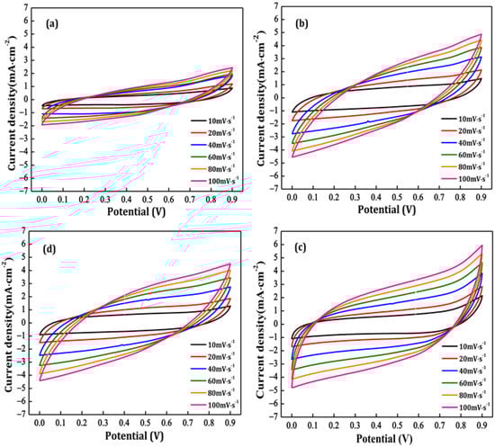 (a) Cyclic voltammograms of NMO-4; (b) NMO-5; (c) NMO-6; (d) NMO-8 electrode at various scan rates (10–100 mV·s−1) in 6 M KOH.