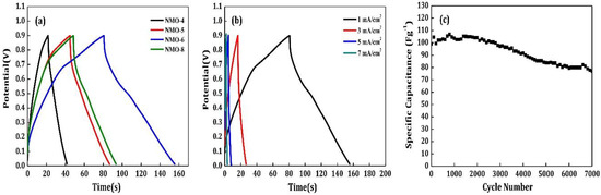 (a) Electrochemical performance of NiMnO3 electrode material with different reaction times; (b) galvanostatic charge discharge (GCD) curve of NMO-6 at different currents; (c) cycling performance of NiMnO3 at 1 mA·cm−2 current density.