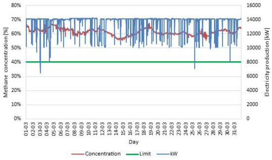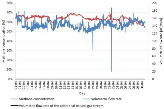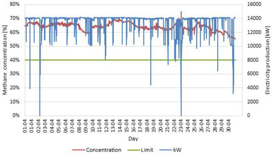 In the analyzed month, both the concentration of captured methane and its flowrate were at a sufficiently high level, which ensured stable operation of gas engines and electricity production of up to 14 MW. Similar results were obtained in the following month—April.