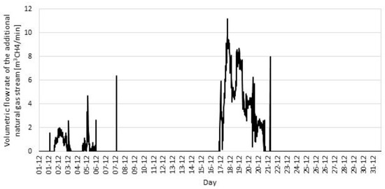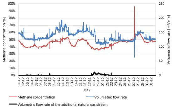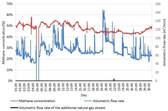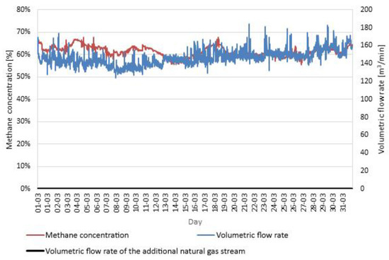 Analyzing the operation of gas engines throughout the year, it was found that the natural gas stream needed to stabilize the methane concentration would amount to a maximum of 16 m3CH4/min. Fluctuations in the concentration and the stream of gas in September and subsequent months resulted from mining operations. Its share in the total methane capture of the mine gradually decreased from 29% in October, through 26% in November to 0% in December. In order to maintain stable operation, it is necessary for the methane drainage system to capture at least 50 m3CH4/min with a minimum concentration of 50%. It is not possible to supplement the stream by capturing methane before and after exploitation because these are too small amounts of methane streams to be obtained. It is therefore necessary to consider other methods of stabilizing the concentration and stream of the captured methane–air mixture.