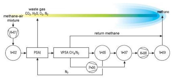 29]. Various configurations of the PSA cycle have been developed, usually consisting of multi-stage processes. The number of components present in the methane drainage mixture requires a combination of processes to obtain a high concentration of methane. Pressure swing adsorption has been described in detail in many studies, mainly in the field of chemistry, often in relation to biogas quality improvement—e.g., [