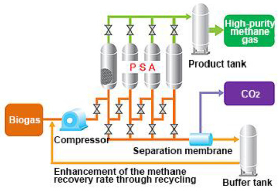 33]. The PSA method is still being improved by making various modifications, such as using new sorbents or combining several methods of gas purification into one system. Such combination seems to achieve the best results. Osaka Gas combined the PSA technology and membrane separation, which achieved a methane concentration of more than 99% for a biogas [