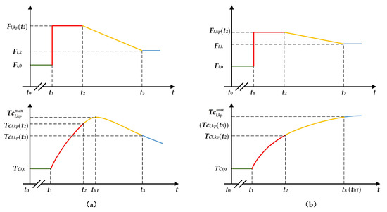 Two typical power flow and temperature variation curves of the post-contingency overload line l: (a) the concave curve of the conductor temperature variation; (b) the monotonous curve of the conductor temperature variation.