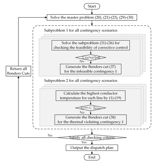 The ESCOPF model is first decomposed into a master problem optimizing the preventive control and two subproblems for the corrective control feasibility check and the line thermal rating check, respectively. In the second subproblem, conductor temperatures are calculated based on the determined power flow distribution in the preventive, post-contingency and corrective stage. Meanwhile, the independence between each contingency is taken into account and both subproblems can be processed in parallel. For those contingencies which cannot pass the corrective feasibility check or the line thermal rating check, corresponding Benders cuts are generated and returned into the master problem. The master problem and subproblems are sequentially solved until both checks are satisfied for all contingency scenarios. The specific solving flow is shown in Figure 2 and detailed formulations for the master problem and two subproblems are presented as follows.