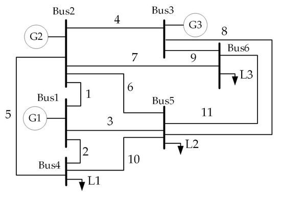 The 6-bus test system consists of three units, three load bus, and 11 transmission lines. Its wiring diagram is presented in Figure 3. Detailed parameters of units, load buses and lines are given by Table A1, Table A2 and Table A3 (Appendix A), respectively. There are 11 “N−1” contingencies where the line k failures in the contingency k. The response time and the ramping time of this system are 5 min and 7 min, respectively, and the rated conductor temperature is conservatively set at 100.00 . The mean program executing time of 10 tests with the consistent convergence solution is 10.07 s. Simulation results in each iteration are shown in Table 3.