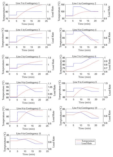 The conductor temperature varies monotonously under the condition that the corrective power flow is higher or slightly lower than it in the post-contingency stage. This corresponds to cases of the highest temperature line in the contingencies 1, 3, 5, 6, and 7. For those lines with highest temperature in the contingencies 2, 4, 8, 9, 10, and 11, the post-contingency power flow is significantly higher than the corrective value while concave temperature curves are presented. In those cases, the maximum absolute difference between load rates in the post-contingency and the corrective stage reaches 0.35, which is obviously higher than the value 0.14 in former cases. This result validates the analysis about two typical temperature variations in Section 2.