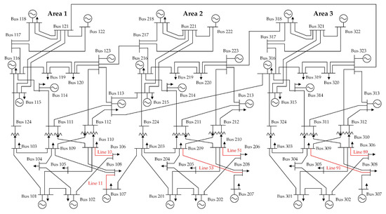 Under the condition of given parameters, the time constant of line thermal process is about 14 min which has been verified in Reference [30]. Meanwhile, the rated load current of lines is set at 992 A while the corresponding steady-state temperature is 100.0 . The widely used “N−1” criterion is adopted for the former two test systems to filter line contingencies. This means, in each contingency, there is just a single transmission line outages. All simulations are performed on a personal computer with 4 Intel (R) Core (TM) i5-6200U CPU (2.3 GHz) (Lenovo, Beijing, China) and 8 GB memory. The programs are implemented using a Matlab (R2016a, The MathWorks, Natick, MA, USA) environment and underlying optimization problems are solved by Cplex.