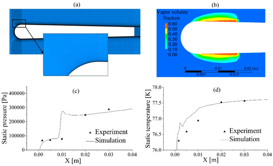 Such a model was justified by some previous investigators in the studies of both conventional hydraulic machines [13,52], and cryogenic turbomachines [7,8,9], with the cavitation models having been verified by the prese t team of authors in our previous publications [42,44]. The cryogenic hydrofoil flow was simulated and the predicted surface static pressure and temperature were consistent with the test data [53] (Figure 3). The predicted hydrofoil cavity length over the upper and lower surfaces was 0.0156 m, which is very close to the experimental value of 0.0152 m by Hord [53].
