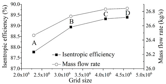 Numerical simulations were conducted for the four groups of grids, and the predicted expander efficiency, mass flow rate and running time are compared in Table 2 and Figure 4. For the grids less than group C, the deviations in overall efficiency were significant; for grid C and D, small deviations were produced, but the computation time increased significantly with the grid size.
