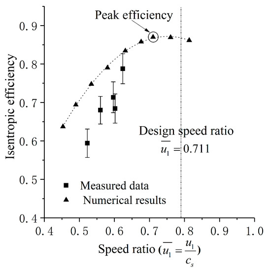 It is noticed that the numerical approach provided more wide-range data than the measured one, and the predicted peak efficiency resided at a speed ratio of 0.71, which is consistent with the ideal theoretical optimal value suggested in [57] (i.e., ).
