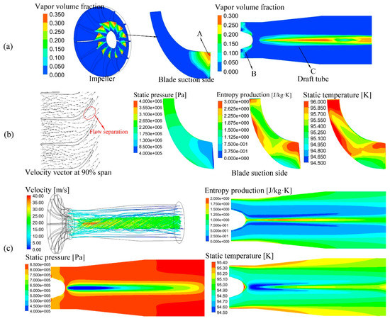 Figure 6a presents the vapor volume fraction for the impeller and diffuser tube, where the cavitation resided mainly in three regions: region A at the impeller blade trailing edge, region B at the diffuser tube inlet and region C around the diffuser tube centerline. The impeller trailing edge cavitation resulted from the mismatched flow behavior, where the blade trailing geometry did not suit the local exit flow, causing the flow to separate from the blade surface, as depicted by the streamline contour on the left of Figure 6b. Such flow separation caused local mechanical head dissipation, as indicated by the entropy contour. Subsequently, local pressure drops and temperature rises occurred, as shown in middle and right of Figure 6b, respectively. The combined effect of low static pressure and high static temperature was responsible for the local cavitation.