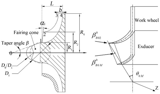 As shown in Figure 7, the impeller meridional was defined by two elliptic parabolic curves of 2-3 and 1-4, and their variations were realized by adjusting R1, R2, R4, b, L, and α1. The impeller comprises a radial-straight work wheel and the twist exducer, where the latter is of a cylinder-parabola curved surface and parameterized by three blade angles of . The fairing cone is used to make a gradual transition of the flow path from the impeller blade passage to the vaneless diffuser tube. The fairing cone head is a sphere of diameter D0, which is tangent to the line 0-1, while β denotes the taper angle.