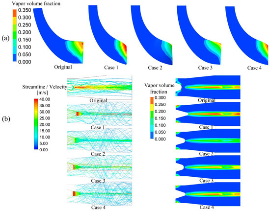 Predicted flow patterns and vapor volume fractions for different geometric combinations: (a) cavitation at impeller blade suction side; (b) diffuser tube flow.