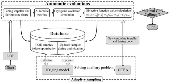 - To effectively suppress cavitation in liquid turbine expanders, a well-suited CFD-based design optimization method was developed. The optimization variables were identified and a flexible variation of the impeller and fairing cone geometries was simultaneously realized where the former was tuned on both levels of the 2D meridian profile and the 3D blade geometry, and the latter was tuned in 2D dimensions. A novel objective function was deliberately established by allowing for both swirling flow and cavitation characteristics, driving the optimizer to search for deswirling and cavitation-resistant geometries. A kriging surrogate model with an adaptive sampling strategy and the CCEA were incorporated to solve the highly nonlinear design optimization globally with a high convergence rate.