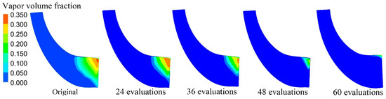 Table 3 presents the flow characteristic parameters obtained respectively from four different combinations of impeller and fairing cone geometries. As the geometric parameters varied within their ranges, each flow characteristic parameter (except the overall performance indicator of η) varied significantly within its own range, demonstrating the sensitive relationship between geometric and characteristic parameters. The variations of the characteristic parameters represented the corresponding variations in the flow behaviors. As shown in Figure 8a, the maximal and minimal vapor volume fraction of the four cases occurred in cases 1 and 2, respectively. According to the scale and intensity of impeller cavitation, the cases could be sorted from strong to weak in the following order: case 1, 4, 3 and 2. The same orders are shown by the predicted characteristic parameter in Table 3.