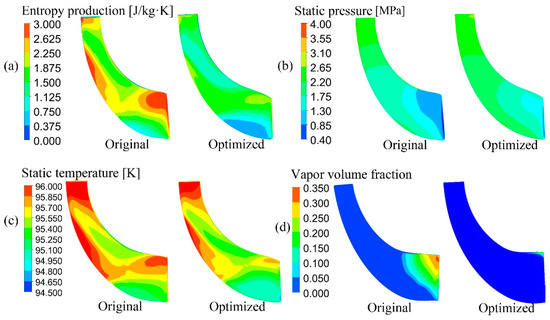 Optimized impeller geometry permits better matched flow, where the local separated flow separation around an impeller exit is effectively suppressed and local mechanical dissipation is subsequently decreased in terms of entropy production. The reduced local pressure drops and temperature rises are favorable for impeller cavitation mitigation, causing the vapor fraction around the impeller exit to vanish.