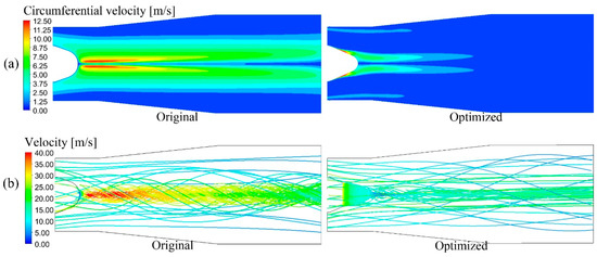 Comparison of diffuser tube swirling flow: (a) circumferential velocity contour; (b) streamline/velocity contour.
