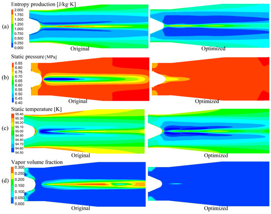 Comparison of diffuser entropy production, static pressure, temperature and vapor fraction: (a) entropy production; (b) static pressure; (c) static temperature; (d) volume vapor fraction.
