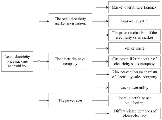 According to the load characteristics of electricity users, electricity sale companies will combine different types of electricity price and electricity tariff levels to formulate retail electricity price packages, and provide certain preferential measures to users based on the differentiated electricity demand for various target customers. The goal of the retail electricity price package design is to adapt to the new electricity market price policy and the power market competition environment, as well as to achieve the electricity sales company’s strategic goals and economic efficiency goals. Finally, it should meet the power users’ electricity demand and reduce electricity costs. According to these aspects, an adaptive evaluation index system for retail electricity price packages is built, as shown in Figure 1.