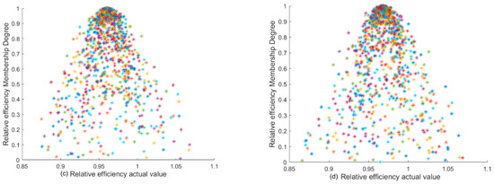 According to the digital eigenvalues of the cloud model of the four retail electricity price packages in Table 3, the corresponding normal cloud images 3a-3d are drawn, as shown in Figure 3, where the abscissa indicates the actual value of the relative efficiency. The horizontal coordinate corresponding to the highest point of the graph represents expectation.