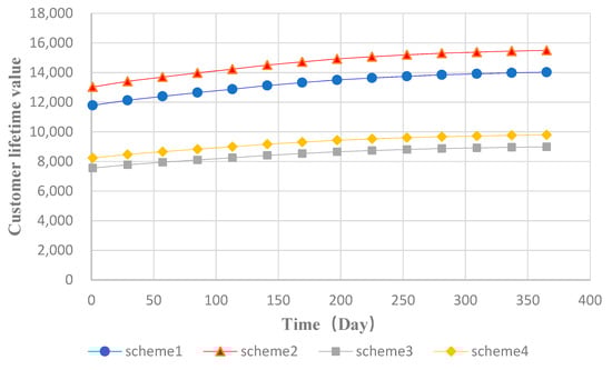 Figure 5 determines that the economic benefits of the retail electricity price packages are increasing. The customer lifetime value of scheme 2 has always been the largest, followed by Scheme 1, Scheme 4 and Scheme 3, which was consistent with the results of the comprehensive applicability evaluation. This indicates that the comprehensive applicability evaluation model is reasonable.