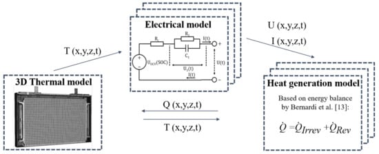 In order to answer the scientific issue of thermal battery behaviour, researchers develop different electro-(chemical)-thermal coupled simulation models [,,,,,,,,]. Most of them are based on the general energy balance for lithium-ion based systems [] in its detailed or simplified form.
