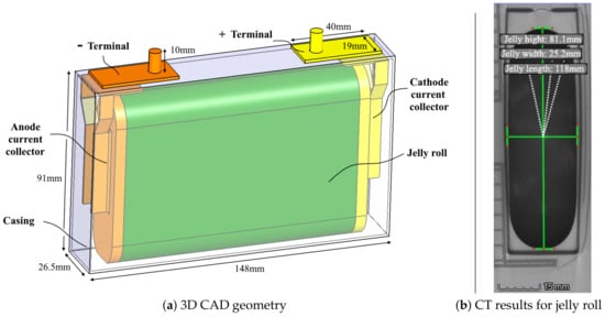 (a) The 3D CAD geometry and outer dimensions of prismatic 25 Ah cell with jelly roll, anode/cathode current collectors, +/− terminals, and casing. (b) Computer tomography (CT) results for jelly roll dimensions.