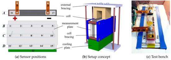 In this work, an automotive battery cell by SANYO PANASONIC is investigated. It is a lithium-ion cell with a nominal capacity of 25 Ah based on nickel–manganese–cobalt (NMC)/graphite chemistry. The cell has a nominal voltage of V with upper and lower cut-off voltage of V and V, respectively. The goal of the experimental setup is to reproduce the mentioned real BEV conditions of a cell in Figure 1b as close as possible in a laboratory setup. Therefore, a single cell measurement setup is designed and implemented. In Figure 4, the sensor schematics (a), the setup concept (b), and the final test bench of the developed setup in the temperature chamber (c) are shown. A custom cooling plate by QuickCool with thermoelectric cooler regulation is used to guarantee constant temperature cooling condition. A proper thermal connection to the cell is achieved with a thermal pad (see properties in Table 1) and a vertical clamping by an external compression unit. Polystyrene foam is used as insulation material to receive mostly adiabatic conditions (see Figure 4c). The cell’s optimal electrical performance is ensured by horizontal bracing plates made of aluminium with a thickness of 10 mm. In-between the horizontal bracing and the cell, two measurement plates of 10 mm POM are added for thermal insulation and measurement.