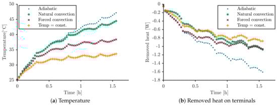 A solution for unknown convection is a fully isolated setup with adiabatic conditions. The fully thermally insulated cell (Adiabatic in Figure 6) shows the highest temperature increase of 22 at the end of cycling. The main issue for validation with this setup is that targeted adiabatic conditions are not fulfilled in the experiment. In any experiment, the large wiring of the battery tester removes heat from the cell, which depends on the temperature increase in the experiment. The resulting heat removal is observable in Figure 6b. This (unwanted) heat sink removes up to of the heat generated in the cell during the experiment with fully insulated setup. That is up to 14% of the overall generated irreversible heat assuming an average cell resistance of 2 m and 75 cycling current. Heat removal by the wiring is an additional issue in all setups. In either case of convection compared to the full insulation setup, the overall temperature rise is lower than under adiabatic conditions. Therefore, less heat is removed by the battery tester connection. Both convection conditions lead to ~ 1 W heat removal at the end of the test, which is a significant influence. Investigating the different cell type of pouch cells in their work, Rieger et al. [] and Erhard [] considered heat removal on the terminals in simulation.