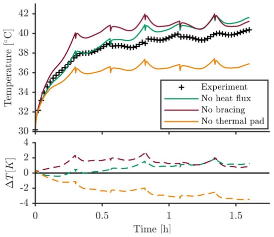 In the previous figure, the heat removal by the wiring in the experiment is discussed. Not considering heat removal as a transient thermal boundary conditions in the model, the temperature increases in the corresponding simulation results (No heat flux). Starting without visible differences during the initial cycles a significant temperature increase of 1–2 K mismatch is visible for the consecutive cycling. It is obvious that other experimental conditions for validation than laboratory BEV conditions would create a much higher deviation to the experiment (see Figure 6).
