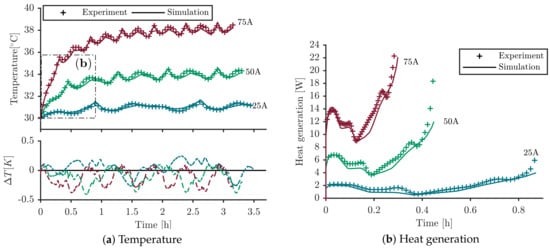 The results in Figure 8b demonstrate that the calculated heat in the simulation has the same magnitude and transient curve form as the heat generations in the experiments. The relative shape depends on the magnitude of the current. With increasing currents, the irreversible heat generation dominates the reversible term. The maximum mean error is W for 75 A with a maximum deviation lower than 2 W. Especially at the end of discharge, near 10% SOC, the measured OCV differs from the real behaviour and create some uncertainty in the calculation of experimental heat generation. The average error of the heat generation in the SOC-range of 100–10% is reduced by 30% resulting in an error of W.