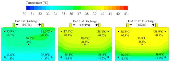 As already mentioned, the goal is to investigate the temperature distribution within the cell during operation with high significance using the validated model. Therefore, the accuracy of local temperature prediction is validated in addition to the average temperature by the example of 75 A current profile. In Figure 9, the temperature distribution on the casing are shown for discrete points during the constant current profile. The geometries display the simulation results including the experimental results on discrete sensor positions (x) and the related deviation of experiment and simulation in percentages.