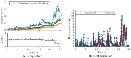 Validation of experiment and simulation for dynamic WLTP cycling of cell under laboratory BEV conditions with: (a) Overall spatially-resolved temperature (nomenclature A–D as in Figure 4) and corresponding spatially-resolved temperature difference and (b) heat generation during WLTP. Staring conditions as well as cooling plate temperature are set to a temperature of at 30 .