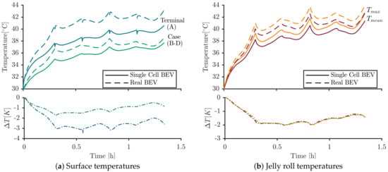 Most crucial temperature concerning safety, ageing, and cooling issues is the jelly roll temperature. In Figure 11b the estimated maximum and average jelly roll temperatures are given. There is a temperature increase for real BEV conditions of 1–2 K but the increase is similar for mean and maximum temperature. Overall, the used laboratory BEV setup reproduces the real BEV application very well and transfers the boundary conditions of a battery system to a practical single-cell setup.
