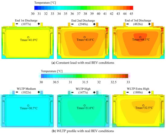 The results for the temperature distribution on the central symmetry plane inside the cell are displayed in Figure 12. The stated value in each sub-figure (◯) is the maximum jelly roll temperature calculated in simulation under real BEV conditions. The heat generation of the cell with constant current cycling (Figure 12a) leads to a maximum temperature inside the jelly roll up to at the end of the third discharge. The highest temperature is reached in the upper part of the jelly roll. The reason for the vertical location is the heat generation inside the jelly roll in combination with the cooling system located at the bottom. Additionally, the increase of the vertical temperature gradient with time is revealed on the casing. The gradient increases from 5 K after the first discharge up to 8 K after the third discharge. Whereas the vertical position is affected by the cooling conditions, the horizontal position is slightly located towards the cathode current collector due to different material properties on anode and cathode. This results in different temperatures in the current collectors. Similar temperatures compared to the jelly roll are detected in the positive current collector due to the ohmic heat generation at the location of high current density.