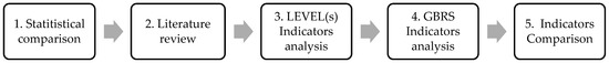 The Level(s) indicators proposed are organized in six different categories: emissions, resources, water, wellbeing and comfort, resilience, and adaptation to climate change [61]. This categorization serves as a basis for a comparison between the most popular GBRSs in the EU. This paper provides a comprehensive top-down critical review between most used GBRSs in the EU and Level(s) to identify potentially emerging conflicts in the application of the new framework. Furthermore, the specific objectives were to: