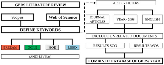 Scopus (SCO) and Web of Science (WOS) were selected as the research databases, according to their relevance in the scientific field [70]. According to the objective of this paper and the results from Section 3.1, the following acronyms were defined as keywords: BREEAM, DGNB, HQE, LEED and Levels in the main search fields as the title, abstract, and keywords. Later, some filters were applied to narrow the results given by search: only journal articles, published after 2008, in the English language. Finally, an author’s personal revision was applied to discard inadequate results that may arise when using the LEED acronym because of its ambiguous significance in other disciplines. The results from both SCO and WOS were finally merged into a single database managed with Mendeley software (Figure 4).