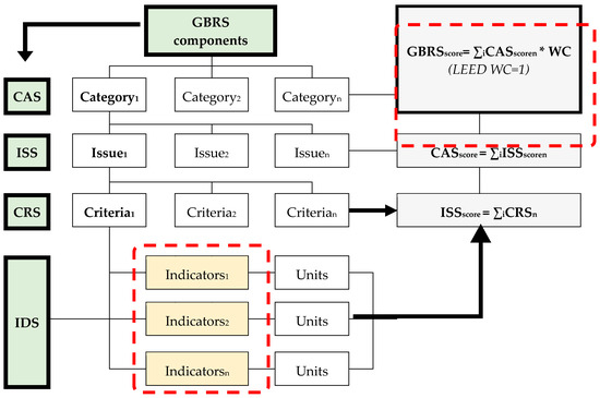 Most common GBRSs like BREEAM, DGNB, HQE, and LEED are based on an hierarchical structure with a top–down organization as follows: categories systems (CAS), Issue System (ISS), Criteria System (CRS), and Indicators system (IDS) [71]. Terms like CAS, CRE, CRS, and IDS are commonly used by different technical manuals and authors [36]. BREEAM terms for structure classification were adopted in this paper [28], as can be seen in Table 2. CAS is defined as a Macro-objective in Level(s), Topic in DGNB, and Theme in HQE. ISS is called the target in HQE [72], requirement in LEED [73], and criteria group in DGNB [30]. Finally, CRS is called the core indicator in Level(s), Criteria in DGNB, Sub-Target in HQE, and Requirements in LEED. From all of these items, the user operation item (UOI) defines the element that must be addressed to obtain the score. This concept is relevant to the methodology because it shows the difficulties in accurately comparing scoring systems of different GBRSs.